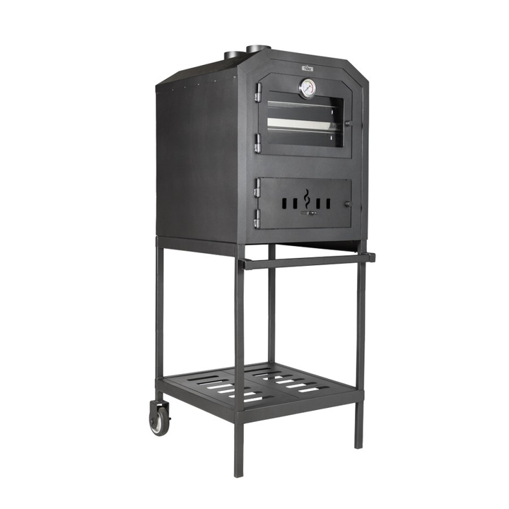 Horno a leña de calor envolvente. En la cámara de combustión de refractarios se quema la leña y sus gases los cuales chocan con el deflector y se dirigen hacia los laterales y luego hacia el techo por donde sale por la chimenea, de esta forma envuelve el calor al horno interno el cual esta enlozado y tiene una salida de vapor de cocción, viene con dos parrillas y una asadera. Viene en tres versiones, para embutir, con y sin carro.