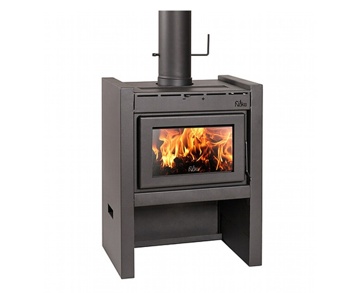 Estufa a leña de 10.000 K/cal. Para superficies de 70 a 90 m2. Recubierto en todo el interior con refractarios, posee dos cámaras de combustión, donde se queman todos los gases (no emite humo ni olor), su sistema de doble combustión logra un alto rendimiento debiomasa. Posee tapa superior escalonada y una puerta con vitrocerámico Schott Robax que soporta 750º de temperatura, con cierre hermético gracias a un contramarco con un cordón de fibrocerámica. La terminación es con pintura de alta temperatura resistente a 800 º. Es de un tamaño muy adecuado para un estar, un comedor, donde la familia suele pasar gran parte del día. El sistema de combustión fue perfeccionado, aumentando de dos a tres combustores, que generan mayor eficiencia a la segunda cámara decombustión.