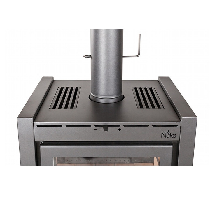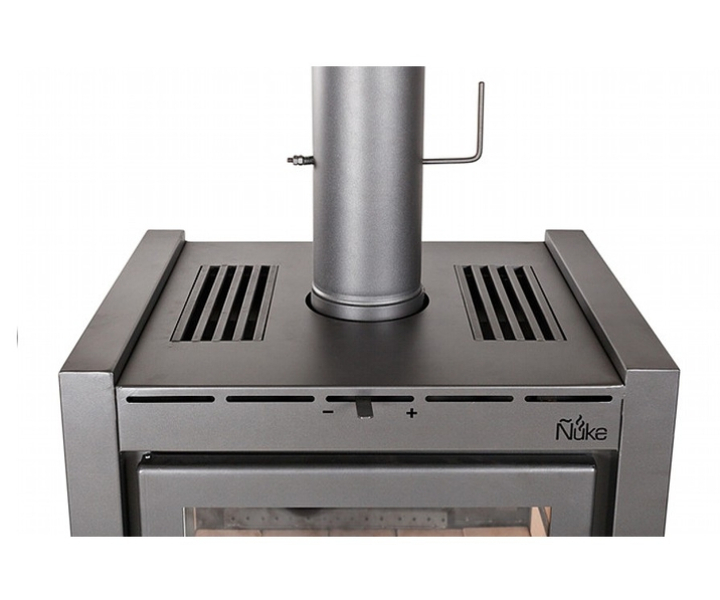 Estufa a leña de gran tamaño de 21.000 K/cal. Para superficies de 100 a 165 m2. Recubierto en todo el interior con refractarios, posee dos cámaras de combustión, donde se queman todos los gases (no emite humo ni olor), su sistema de doble combustión logra un alto rendimiento de biomasa. Tiene una gran visibilidad del fuego. Entrada del aire vertical para limpiar el vitrocerámico Schott Robax, pintura de alta temperatura, cierre de puerta con un cordón de fibrocerámica y bisagras ocultas. Se genera calor por convección y por radiación, con el mismo sistema de combustión Ñuke. Como todas las Ñuke Lapacho su gran tamaño y su armonía estética le dan una presencia proporcional a los amplios ambientes donde se instala.