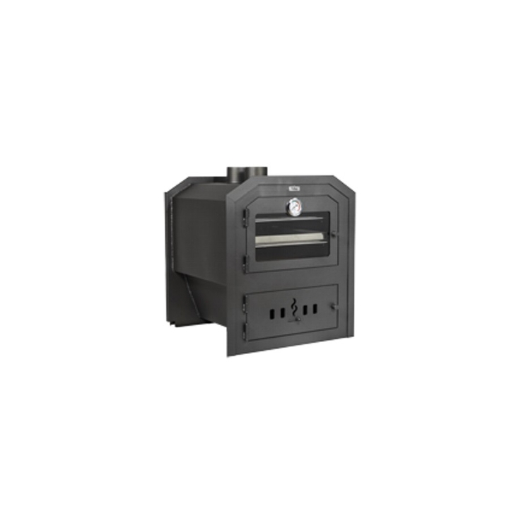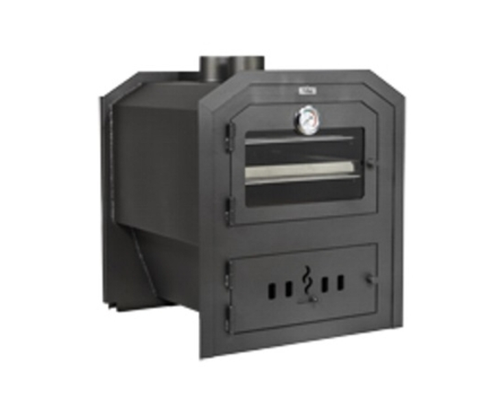 Horno a leña de calor envolvente. En la cámara de combustión de refractarios se quema la leña y sus gases los cuales chocan con el deflector y se dirigen hacia los laterales y luego hacia el techo por donde sale por la chimenea, de esta forma envuelve el calor al horno interno el cual esta enlozado y tiene una salida de vapor de cocción, viene con dos parrillas y una asadera. Viene en tres versiones, para embutir, con y sin carro.