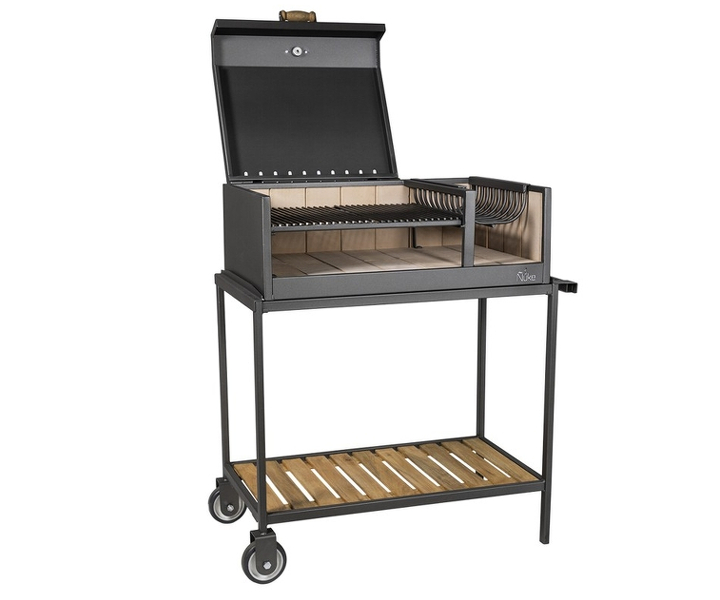 Una parrilla tradicional para desarrollar sus capacidades culinarias. Posee una parrilla de hierros redondos enlozados y a continuación un brasero para encender con facilidad el carbón o la leña, sobre este se puede colocar una plancha o wok donde cocinar vegetales, filetes, provoletas, etc.