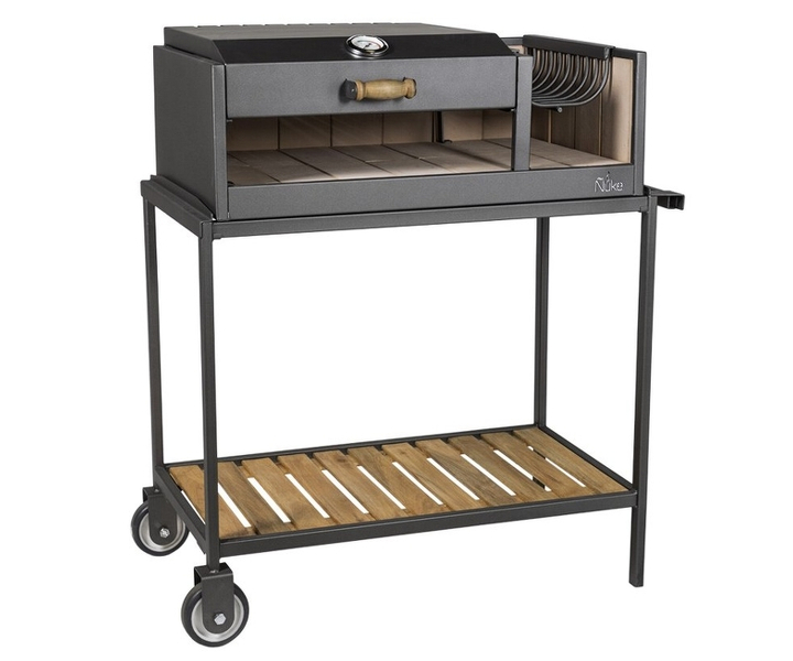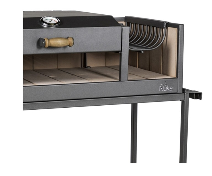 Tiene una tapa ideal para hacer pizzas a la parrilla o para días ventosos. El piso y los laterales están compuestos de ladrillos de refractarios que le suman durabilidad a la parrilla y un mejor rendimiento al calor logrado. Montada sobre un carro con ruedas para poder poder trasladarla al lugar de su preferencia. En la base del carro hay un estante de madera para apoyar los elementos que desee. Ofrecemos como adicional una Plancha Ñuke que se puede usar sobre la parrilla o sobre el brasero y una funda para protegerla del sol y lluvia.